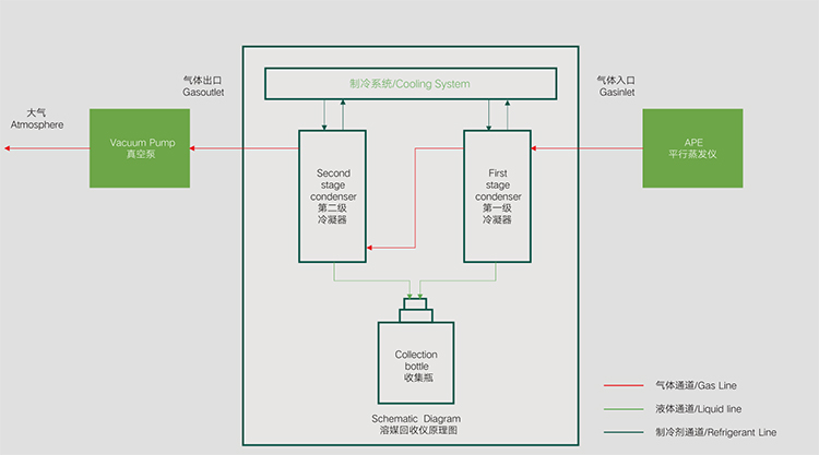 “干式”低溫冷凝——溶劑回收更高效 APE 系列不僅可以選擇傳統的冷卻循環水機搭配玻璃冷凝器對溶劑蒸汽進行冷凝回收,還可以選配 eSR220S 溶媒回收儀對溶劑蒸汽進行高效冷凝回收,溶媒回收儀采用“干式”低溫冷凝技術,無需使用冷卻循環液,-20℃低溫下對溶劑蒸汽直接進行冷凝,特別適合低沸點溶劑高效冷凝收集。